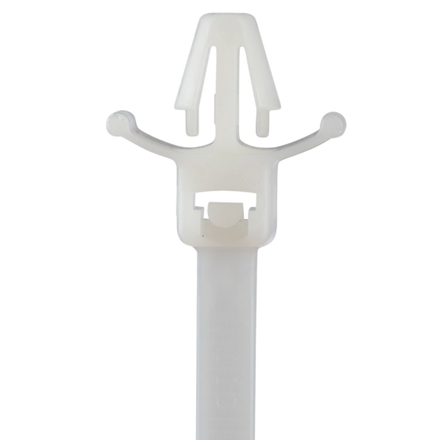 Panduit PLWP1.5I-D Locking Wing Mount Push Ties use an all-in-one design to attach bundles to another surface using a stable, secure, rattle-free installation. Intermediate cross section, 6” (152mm) length. For indoor use, made of Nylon 6.6, are natural in color and come in packages of 500.